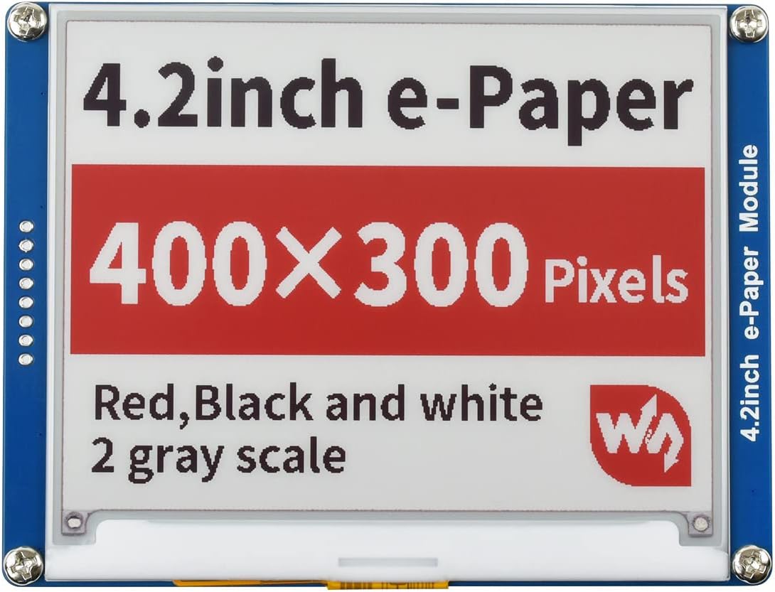 The Waveshare 4.2-inch E-Ink Display Module (B) is a low-power, high-resolution display solution designed for various embedded applications. It features a 400x300 pixel resolution and supports a three-color display (red, black, and white). The module includes an embedded controller and communicates via an SPI interface, making it compatible with popular development boards such as Raspberry Pi, Arduino, and Nucleo.